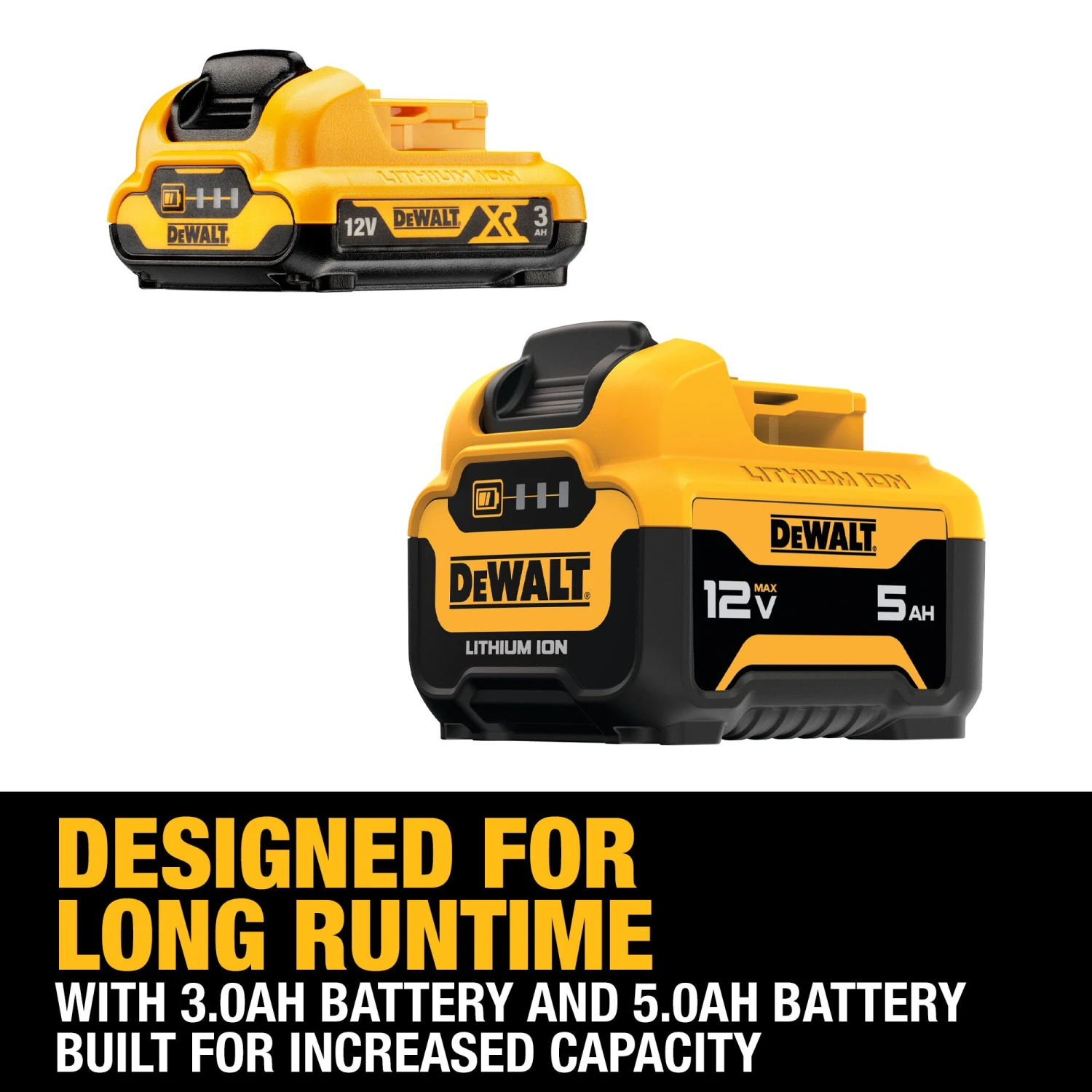 Designed for long runtime with 3.0Ah battery (DCB124) and 5.0Ah battery built for increased capacity (DCB126)