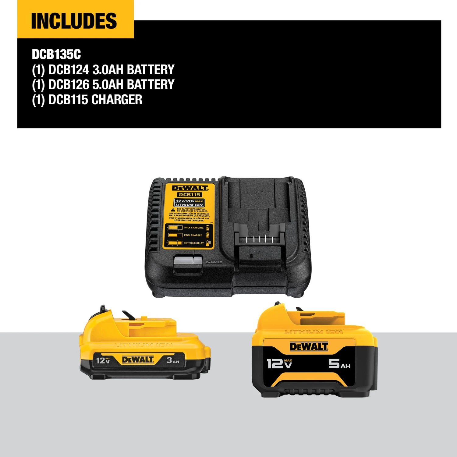 Includes: (1) 3.0Ah battery (DCB124); (1) 5.0Ah battery (DCB126); and (1) High Compatibility Charger (DCB115)