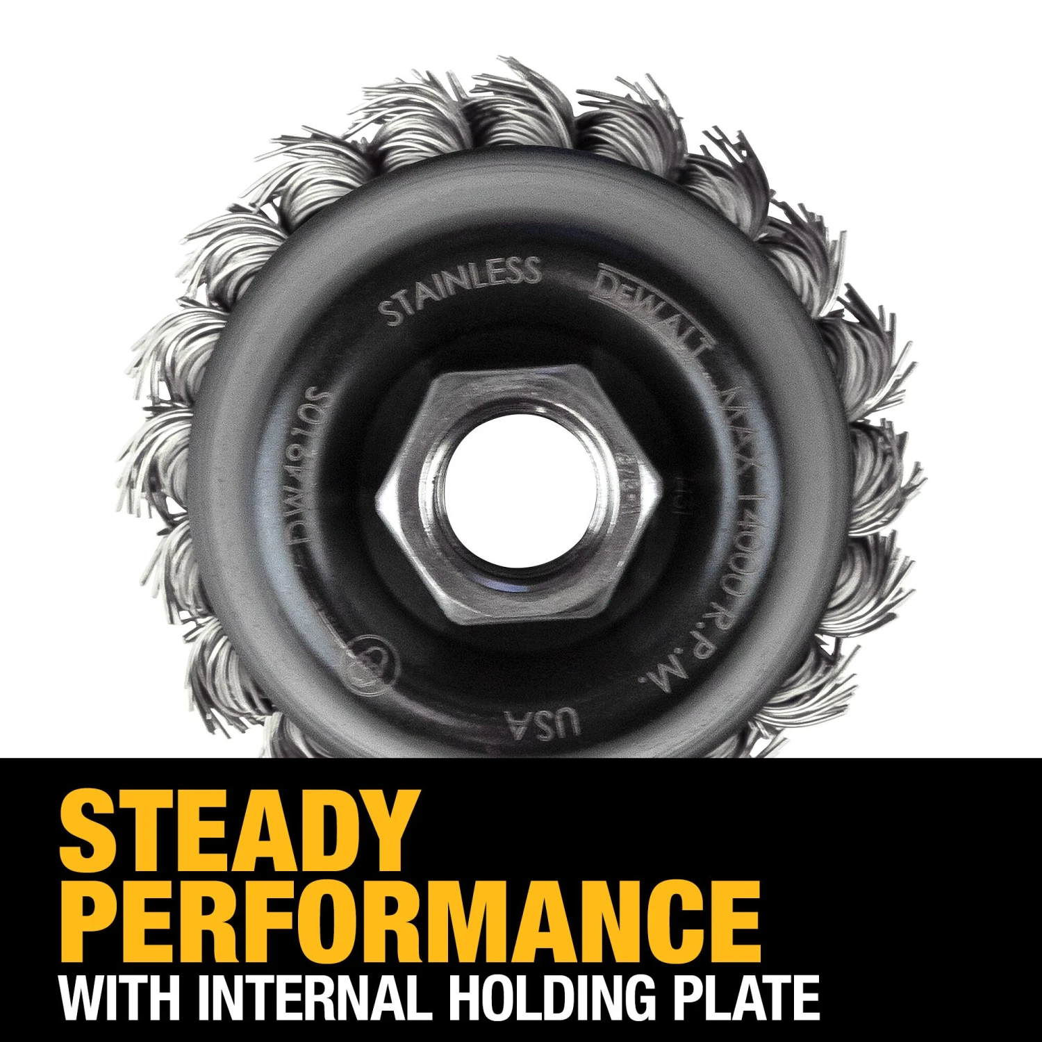 Carbon knot wire cup brush is counterbore with an internal holding plate to ensure consistency and safety.