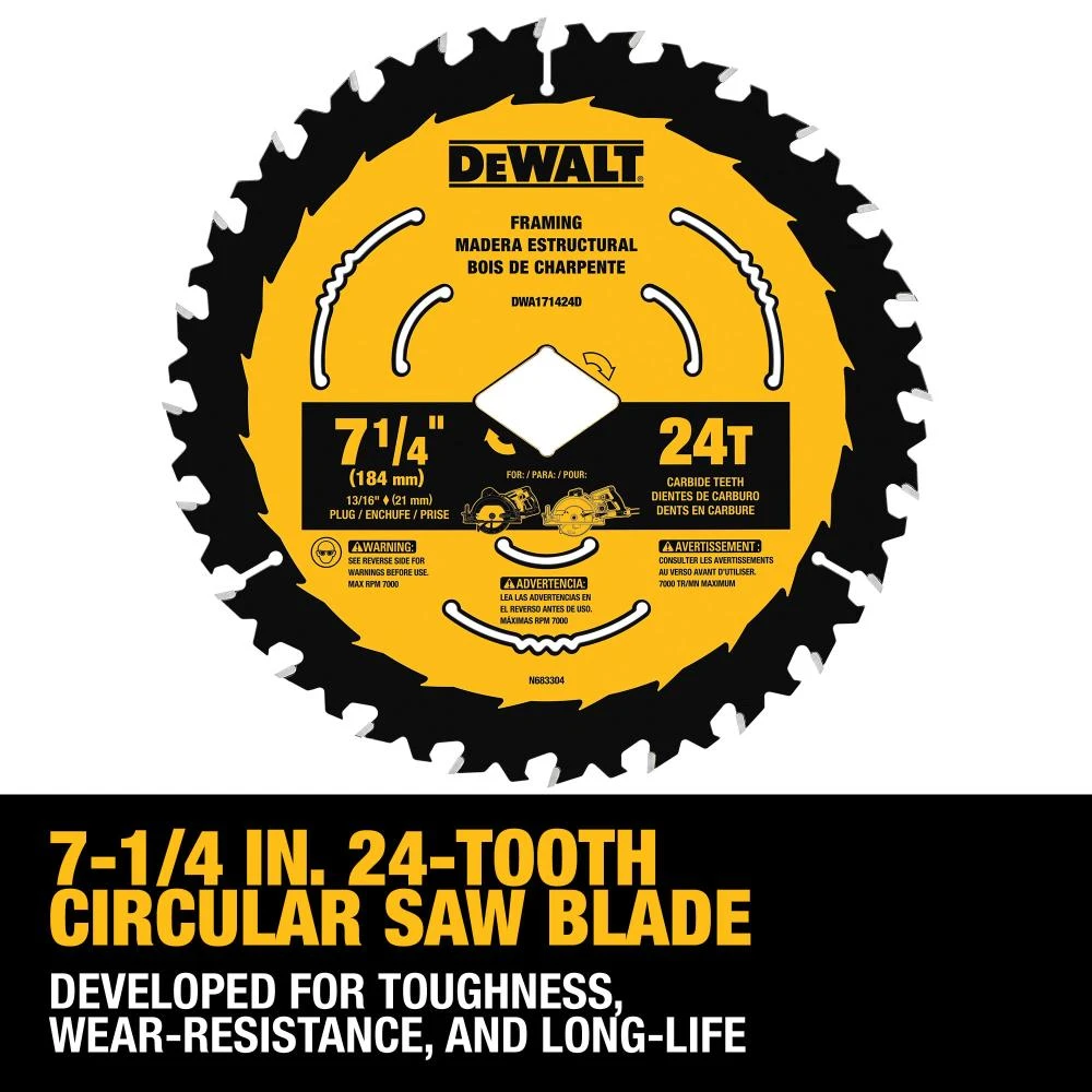 DEWALT 7-1/4-in 24-Tooth Tungsten Carbide-Tipped Steel Circular Saw Blade with ToughTrack tooth design for accurate tracking over the life of the blade, patented body slots reduce vibration for exceptional feel, made of high-density tungsten carbide
