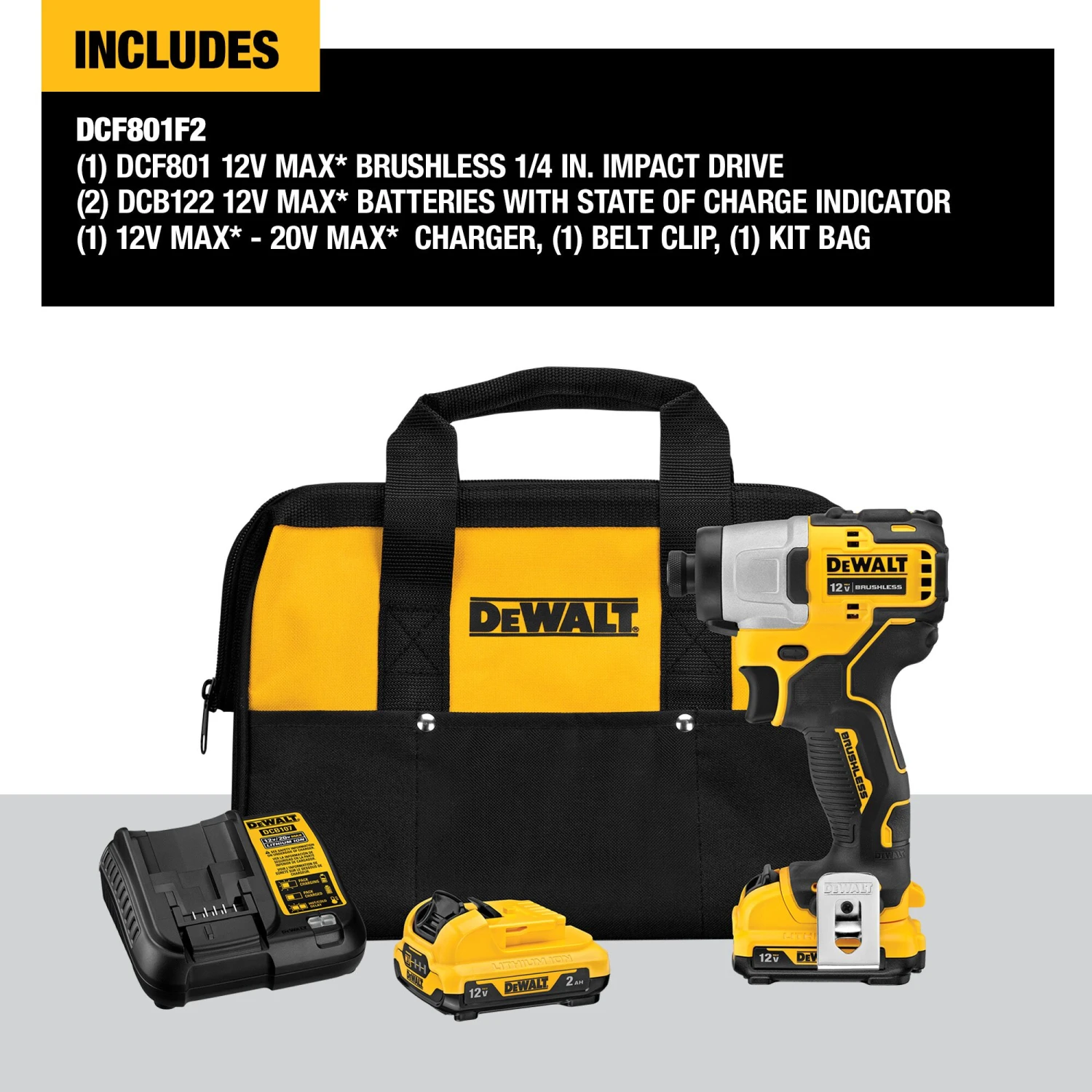 Includes: (1) DCF801B 12V MAX Brushless 1/4-in Impact Driver, (2) DCB122 12V MAX* batteries, (1) DCB112 12V/20V MAX* Charger, (1) Belt Clip, (1) Kit Bag